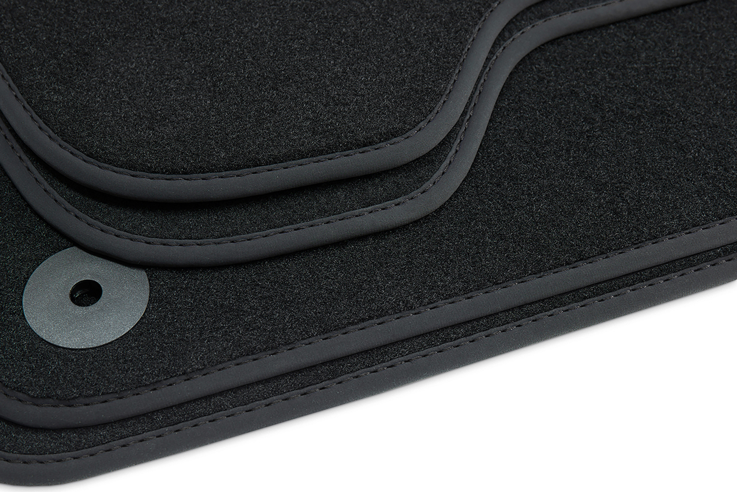 Hochwertige Velours Fußmatten mit Nubuk Bandeinfassung, Befestigung und eingearbeiteten Ziernähten.